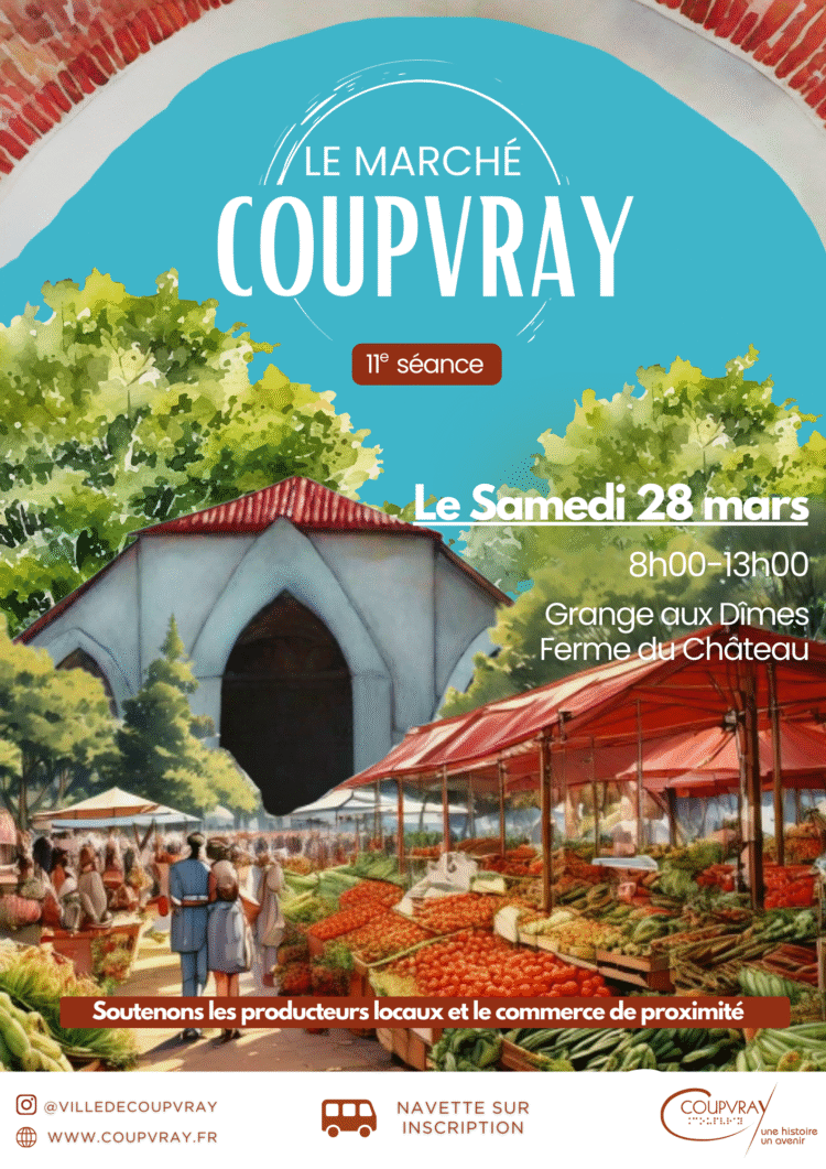 A chaque séance, retrouvez vos commerçants préférés : le torréfacteur La Bordée, un primeur, un charcutier, un boucher, un fromager, plusieurs traiteurs, un rôtisseur, un boulanger, un maraîcher ainsi que d’autres producteurs locaux. Une buvette est à votre disposition pour passer un moment convivial et déguster les bons produits du marché. Afin de permettre au plus grand nombre de prendre part au marché, la municipalité a mis en place une navette, « Couvpray Express », utilisable sur inscription au plus tard 48h avant l’événement, pour les personnes ayant des difficultés de mobilité (seniors, personnes non véhiculées, etc). Pour réserver : navette@coupvray.fr